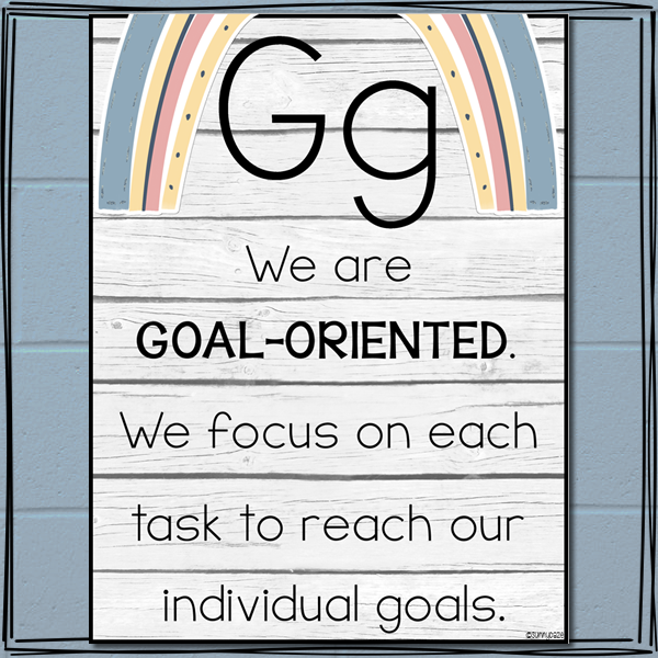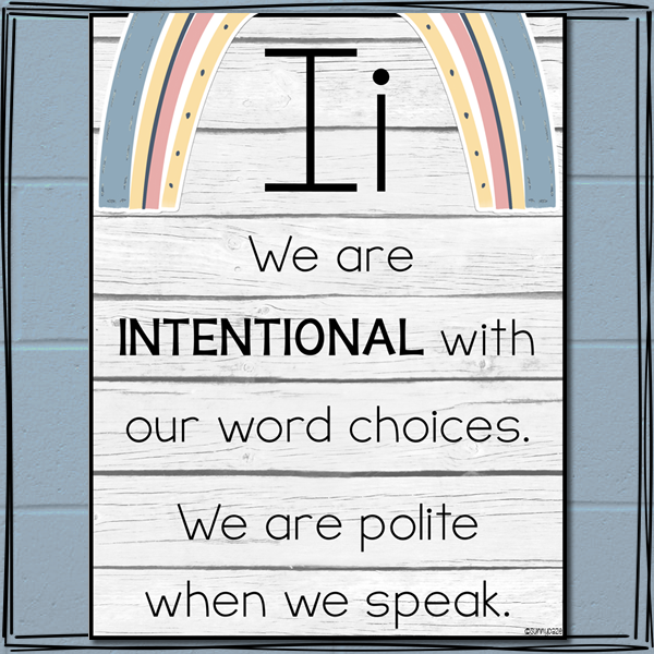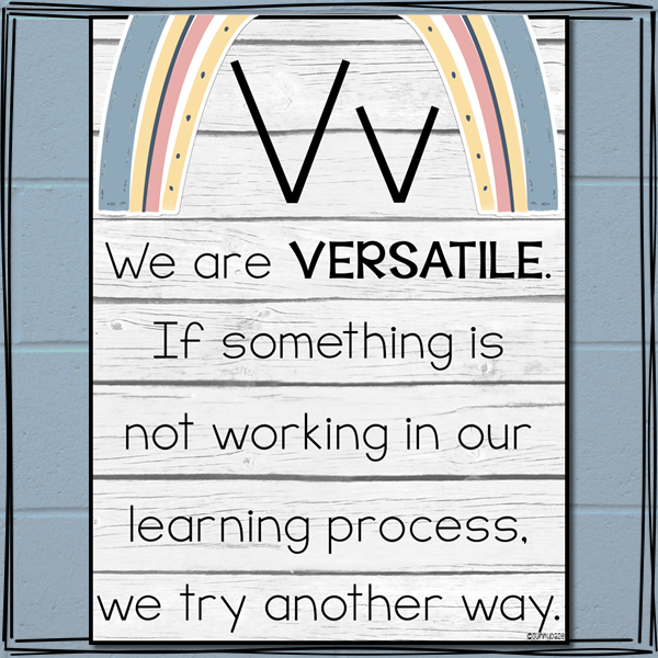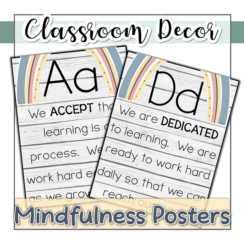 This set of 26 A-Z class behavior expectations & mindfulness posters not only decorate your classroom but give important encouragement as well. Each shiplap boho rainbow themed poster contains a letter from the alphabet with a corresponding word and explanation. The A-Z letters appear in a printed font (KG Part of Me).